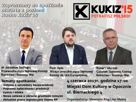 Sławomir Róg i Jan Madej zapraszają na spotkanie otwarte z posłami Ruchu Kukiz’15, które odbędzie się 4 czerwca 2017 roku o godzinie 17:00 w Miejskim Domu Kultury w Opocznie.