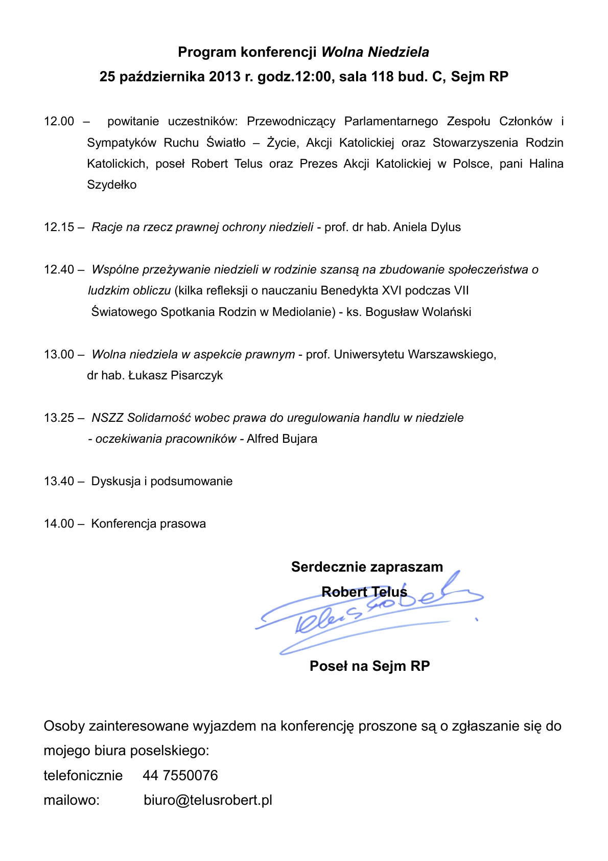 Poseł na Sejm RP, Robert Telus zaprasza w imieniu Parlamentarnego Zespołu Członków i Sympatyków Ruchu Światło-Życie, Akcji Katolickiej oraz Stowarzyszenia Rodzin Katolickich zapraszam na konferencję Wolna Niedziela, współorganizowaną przez Akcję Katolicką w Polsce, NSZZ Solidarność, Ruch Światło – Życie oraz legnicki Społeczny Ruch Świętowania Niedzieli.