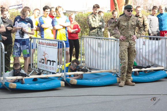 Po pokonaniu dystansu zawodnik wykona 3 strzały z replik broni typu ASG do celu, z wyznaczonych stanowisk w pozycji leżącej. Za każdy strzał niecelny zawodnik wykonuje rundę „dodatkową” na dystansie 50 m. (podobnie jak w biathlonie). Po zakończeniu rundy następuje zmiana zawodnika poprzez dotknięcie w ramię (zawodnicy biegną bez pałeczek sztafetowych i bez broni).