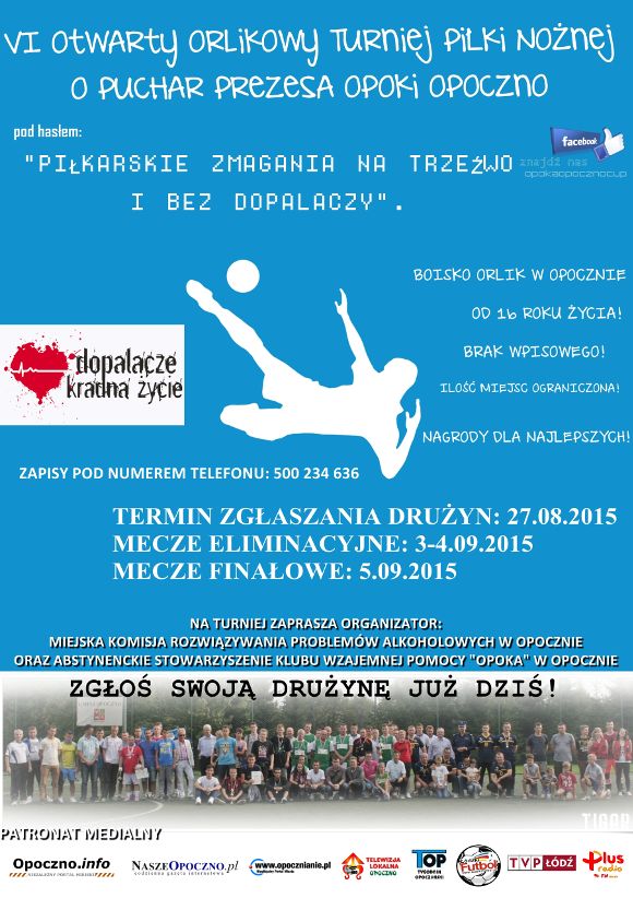 Abstynenckie Stowarzyszenie Klubu Wzajemnej Pomocy „OPOKA” oraz Miejska Komisja Rozwiązywania Problemów Alkoholowych w Opocznie ma zaszczyt zaprosić do udziału w VI Otwartym Orlikowym Turnieju Piłki Nożnej o Puchar Prezesa Opoki Pana Krzysztofa Mirosa. Tegorocznej edycji przyświecać będzie hasło „Piłkarskie zmagania na trzeźwo i bez dopalaczy.”