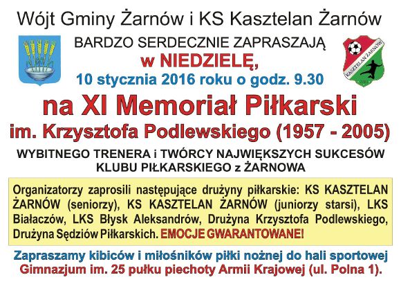 Wójt Gminy Żarnów oraz KS Kasztelan Żarnów serdecznie zapraszają na XI Memoriał Piłkarski im. Krzysztofa Podlewskiego, który odbędzie się w niedzielę, 10 stycznia 2016 roku w hali sportowej Gimnazjum im. 25 pułku piechoty Armii Krajowej w Żarnowie.