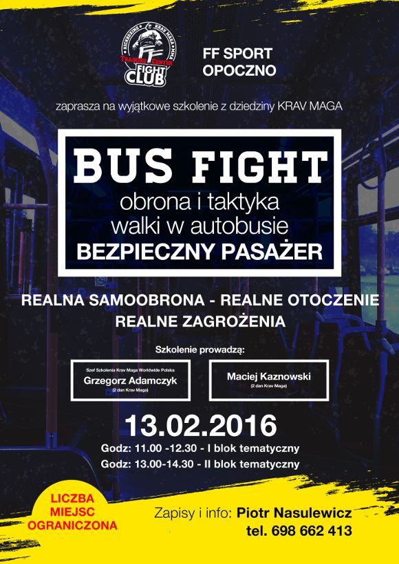 FF Sport Opoczno zaprasza na szkolenie z obrony i taktyki walki w autobusie, które odbędzie się 13 lutego 2016 roku.