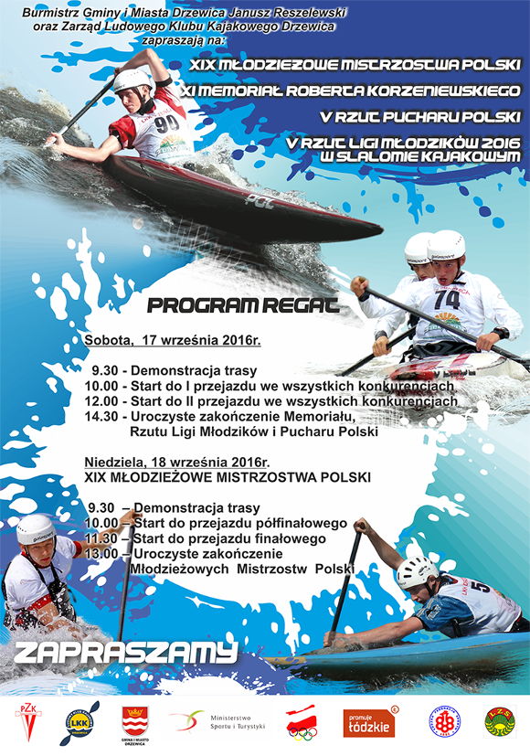 Burmistrz Gminy i Miasta Drzewica oraz Zarząd Ludowego Klubu Kajakowego w Drzewicy zapraszają na regaty kajakowe, które odbędą się 17 i 18 września w Drzewicy. W ramach imprezy rozegrane zostaną XIX Młodzieżowe Mistrzostwa Polski, XI Memoriał Roberta Korzeniewskiego, V rzut Pucharu Polski oraz V rzut Ligi Młodzików w clalomie kajakowym.