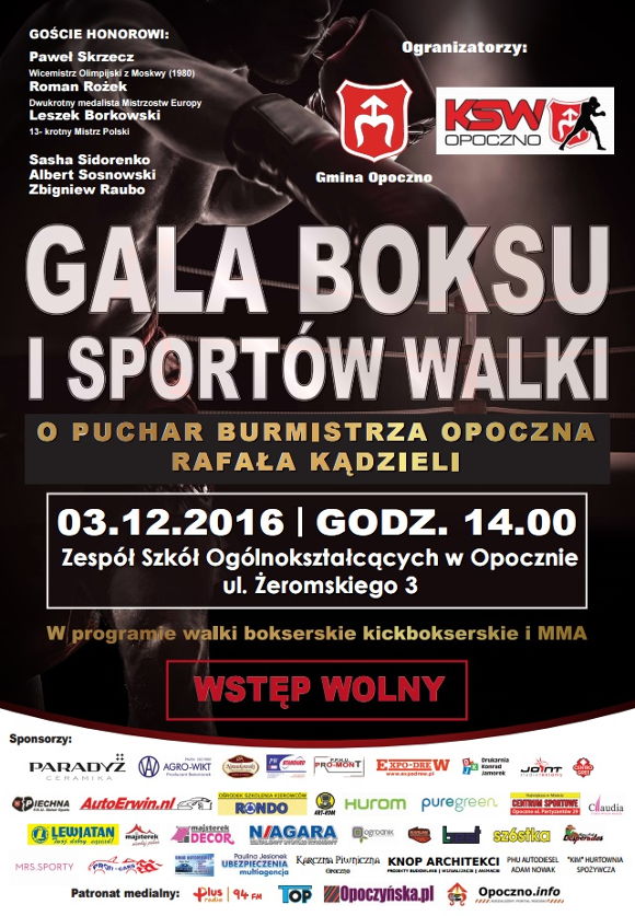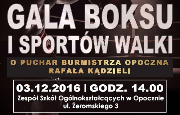 Serdecznie zapraszamy na Galę Boksu i Sportów Walki o Puchar Burmistrza Opoczna Rafała Kądzieli, która odbędzie się w sobotę, 3 grudnia w Hali Sportowej I Liceum Ogólnokształcącego im. Stefana Żeromskiego w Opocznie.