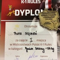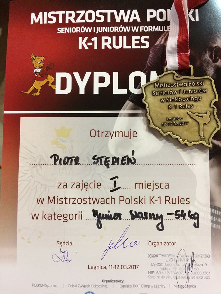 Piotr Stępień po wygranej pierwszej walce przez poddanie zawodnika i drugiej wygranej jednogłośnie na punkty zdobył tytuł Mistrza Polski Juniorów Starszych 2017 i tym samym zdobył kwalifikacje do Kadry Narodowej Polskiego Związku Kickboxingu przygotowującej się w tym roku do Mistrzostw Europy, które we wrześniu odbędą się w Macedonii.