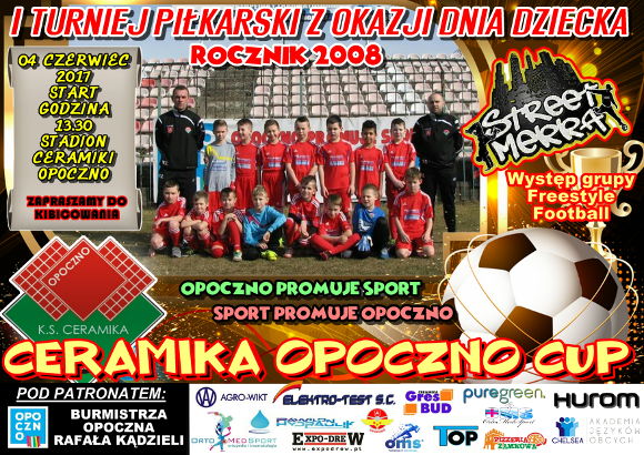 4 czerwca 2017 r. (niedziela) o godzinie 13:30 na boisku Ceramiki Opoczno al. Sportowa 1 w Opocznie odbędzie się I Turniej Piłkarski z okazji Dnia Dziecka rocznika 2008 „Ceramika Opoczno Cup 2017" zorganizowany przez klub Ceramika Opoczno wraz z rodzicami pod Patronatem Burmistrza Opoczna Rafała Kądzieli.