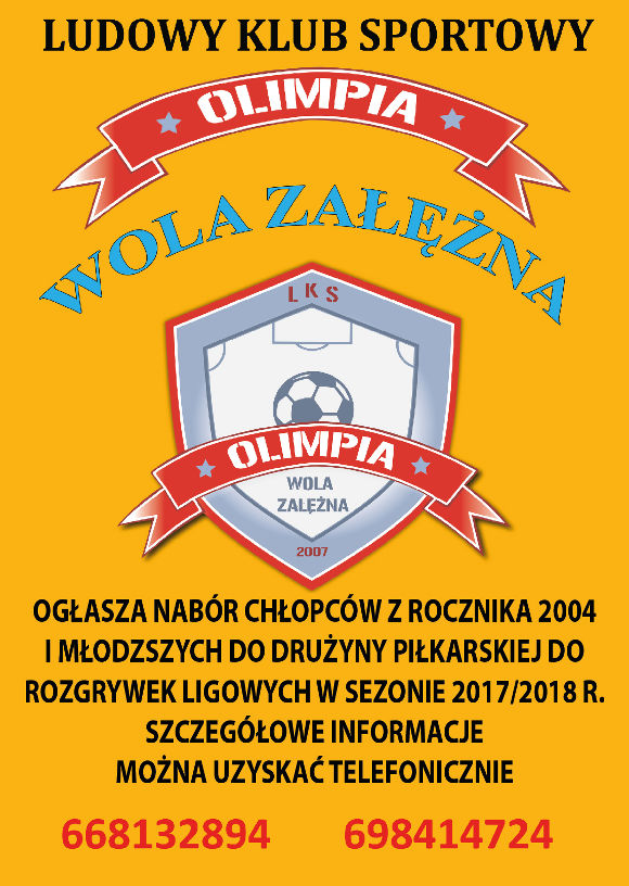 Ludowy Klub Sportowy Olimpia Wola Załężna ogłasza nabór chłopców z rocznika 2004 i młodszych do drużyny piłkarskiej. Drużyna weźmie udział w rozgrywkach ligowych w sezonie 2017/2018.