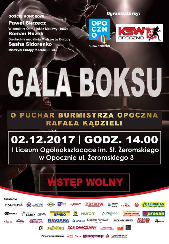 KSW KO Opoczno oraz Burmistrz Opoczna Rafał Kądziela zapraszają na III Galę Boksu o Puchar Burmistrza Opoczna, która odbędzie się w sobotę, 2 grudnia 2017 roku w hali sportowej Zespołu Szkół Ogólnokształcących przy ulicy S. Żeromskiego 3. Start o godzinie 14:00.