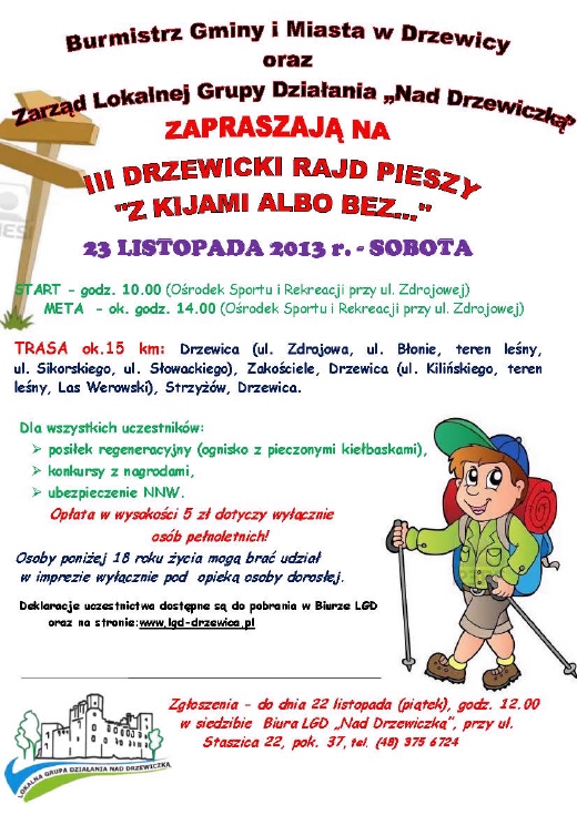 Burmistrz Gminy i Miasta Drzewica wraz z Zarządem Lokalnej Grupy Działania „Nad Drzewiczką” zapraszają na III Drzewicki Rajd Pieszy „Z kijami albo bez...”, który odbędzie się w sobotę, 23 listopada 2013 roku.